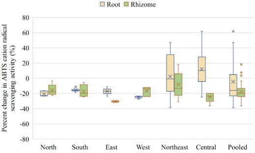 Figure 5 Box-whisker plots showing the percent change in ABTS cation radical decolorization activity in the roots and rhizomes of B. rotunda sourced from various regions of Thailand, as well as pooled data, in gamma-irradiated samples compared to non-gamma-irradiated samples.
