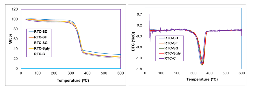 The SEM images reveal how different carbon sources affect BC structure. Overall, glucose (RTC-SGlu) and dextrose (RTC-SD) produce denser, more organized networks, while glycerol (RTC-SGly) results in a looser structure. The thicker BC layers in RTC-SD and RTC-SGlu before drying likely contribute to their denser fibrils, aligning with their higher wet yields. In contrast, RTC-SGly’s thinner network reflects its lower wet yield. Some impurities, especially in RTC-C, are visible in the SEM images, likely residues from alkali purification.