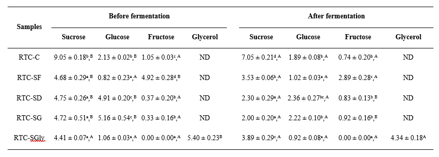 HPLC analysis revealed significant changes in sugar profiles ( Table 2 ). Initial concentrations ranged from 4.41% -9.05% sucrose, 0.82% - 5.16% glucose, 0% - 4.92% fructose, and 5.40% glycerol (RTC-SGly). Glucose and fructose in samples without added glucose/dextrose resulted from sucrose hydrolysis during autoclaving and kombucha culture activity. Previous studies confirm similar findings, with autoclaving a 3% sucrose solution yielding 0.7% - 0.9% glucose [27] and full sucrose hydrolysis at pH 2 [28].