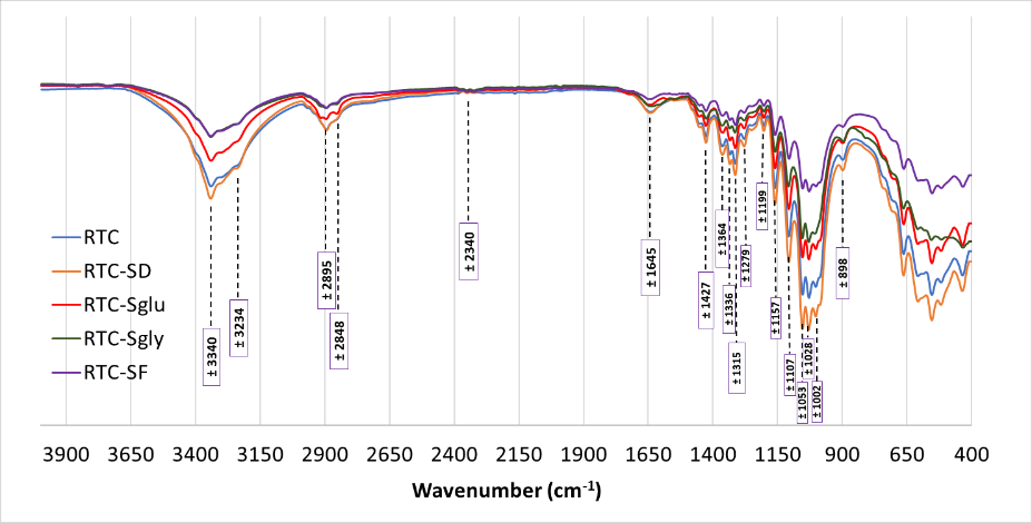 Figure 5 presents the FTIR spectra of BC samples derived from RTC kombucha fermentation using various carbon sources. All samples display similar absorption bands, although their intensities differ. The spectra confirm characteristic cellulose absorption bands, with variations in band intensity consistent with previous studies [55-57].