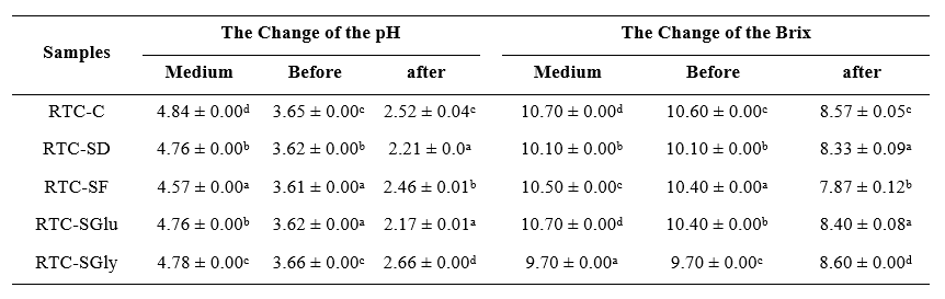 This study monitored changes in pH and total soluble solids (TSS) during fermentation ( Table 1 ). The initial pH of the medium (ranging from 4.57 to 4.84) decreased slightly to 3.61 - 3.66 after inoculation, then dropped significantly to 2.17 - 2.66 by day 15. Among the carbon source treatments, RTC-SGlu resulted in the lowest final pH, while RTC-SGly had the highest. The initial pH reduction is likely due to the acidity of the starter culture, while the continued decline is attributed to the production of organic acids such as acetic, gluconic, lactic, and citric acids [14,20]. Similar acidification patterns have been reported in previous kombucha studies, with pH decreasing from 3.04 to 2.63 after 10 days [21], and final pH values ranging from 3.36 to 3.82 [22] and 2.72 to 2.79 [23], aligning with the typical pH decline observed during fermentation.