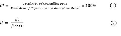 where CI is the crystallinity index, d is the crystallite size, K is the Scherrer constant (0.89), λ is the X-ray wavelength (1.5406 Å), β is the full width at half maximum (FWHM) in radians, and θ is the Bragg angle [17] .