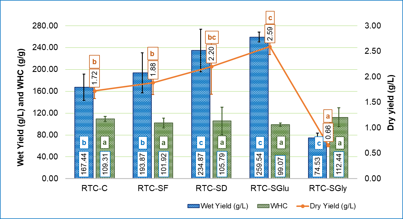 Figure 2 Wet yield (g/L), dry yield (g/L), and water holding capacity (WHC) (g water/g cellulose) of BC produced from RTC kombucha using different combinations of carbon sources. Different lowercase letters indicate significant differences among treatments ( p < 0.05, LSD test).