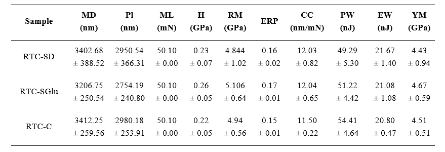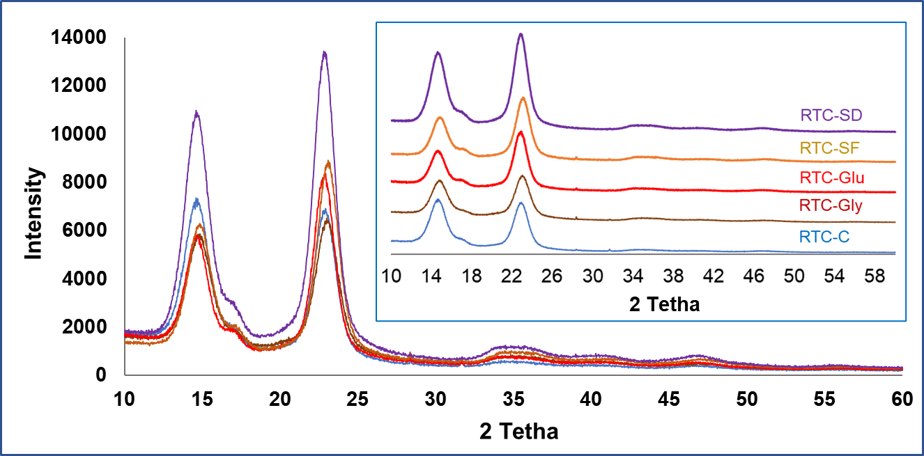The crystallinity index (CI) and crystallite size of BC samples were determined from XRD data using the Segal method ( Table 3 ). CI values ranged from 84.74% (RTC-SGly) to 89.54% (RTC-C), with RTC-SD and RTC-SF showing relatively similar values. All mixed carbon source samples had lower CI than sucrose-only RTC-C. BC crystallinity depends on multiple factors, including carbon/nitrogen sources, additives, bacterial strain, fermentation conditions, and post-processing [67,68]. These results agree with previous studies: K. medellinensis produced BC with 83% - 90% CI using different sugars [69], K. hansenii achieved >80% CI with glucose/glycerol [13], and Komagataeibacter sp. W1 showed 74% - 89% CI across various carbon sources [55]. These findings confirm that carbon source selection significantly impacts BCʼs crystallinity and structural properties.