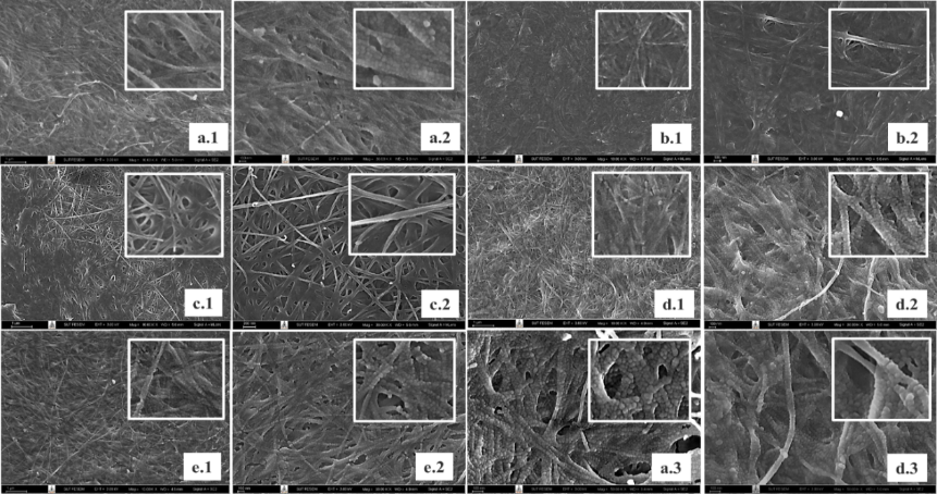 Figure 3 SEM image of BC (a) RTC-control; (b) RTC-SF; (c) RTC-SD; (d) RTC-SG; and (e) RTC-SGly; (1) magnification of 10,000 × ; (2) magnification of 30,000 × ; (3) magnification 50,000 × .