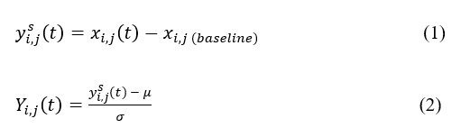 where ysi,j(t) is the response of i-th sensor to the j-th sample at time-t after baseline correction. xi,j (t) is the response of i-th sensor to the j-th sample at time-t, xi,j (baseline) is the response of i-th sensor to the j-th sample at baseline time, Yi,j (t) is the normalized response of i-th sensor to the j-th sample at time-t, μ is mean, and σ is the standard deviation.
