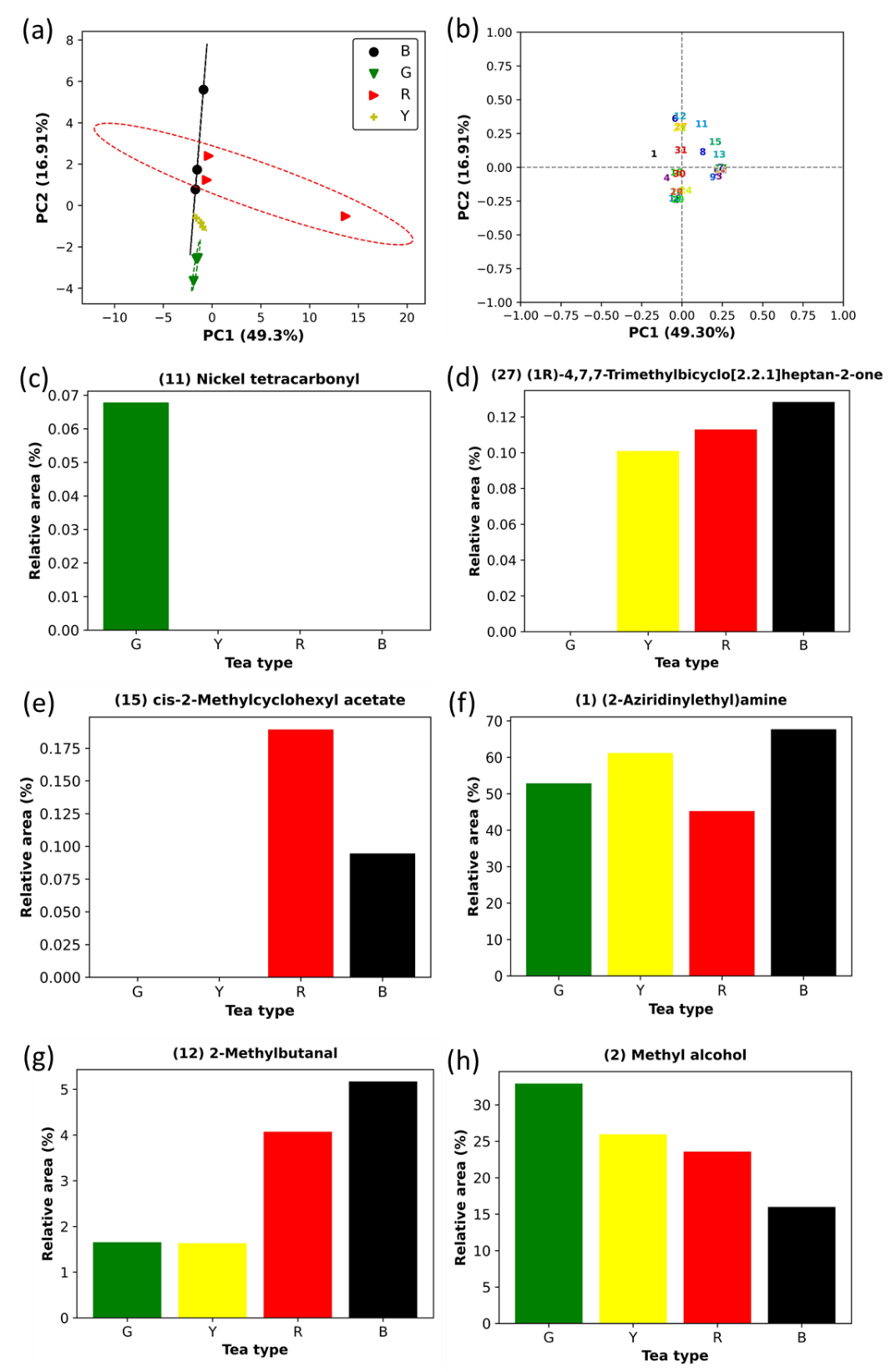 Figure 6 The metabolomic analysis performed using GC-MS: (a) PCA score plot, (b) PCA loading plot, (c) (h) representative volatile compounds identified as potential biomarkers indicative of tea types.
