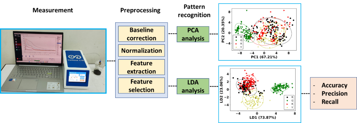 Sensory evaluation by professional panels is commonly used to distinguish between fermented and non-fermented teas. However, this method is inherently subjective as human physical and mental conditions influence it [12-14]. Analytical techniques such as gas chromatography-mass spectrometry (GC-MS) and high-performance liquid chromatography (HPLC) are also utilized to complement this approach. GC-MS effectively identifies high-volatile compounds, while HPLC targets low-volatile compounds [15]. Despite their high sensitivity in compound identification, both methods have limitations, including time-consuming processes and high costs [16,17], which makes them less practical for rapid and large-scale tea classification. As an alternative approach, the electronic nose (e-nose) offers a faster, non-invasive, and cost-effective solution, making it beneficial for industries that require real-time quality control.