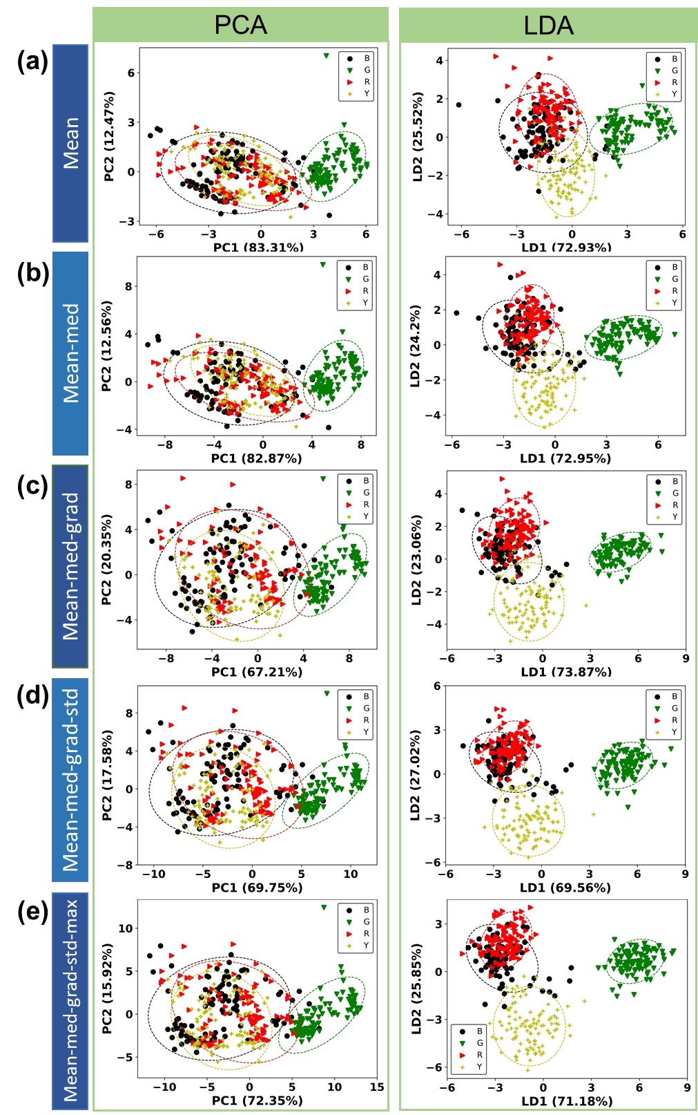 The statistical feature methods were optimized through the following steps: First, the calculation of silhouette score: Silhouette score was selected as the feature ranking criterion because it quantifies how well the transformed data points are grouped into distinct classes by comparing the average distance of a sample to points in its class with the average distance to points in the nearest other class. In this study, the silhouette score was computed in the LDA space rather than in the original feature space, ensuring that the score reflects the contribution of each feature method to the optimal class separation achieved by the classifier. The calculation used only the training data to avoid information leakage. Each feature extraction was first applied individually, transformed into the LDA space, and then assigned a silhouette score. The silhouette score for each feature extraction was computed based on the performance of the LDA model using Eq. (3) [39].