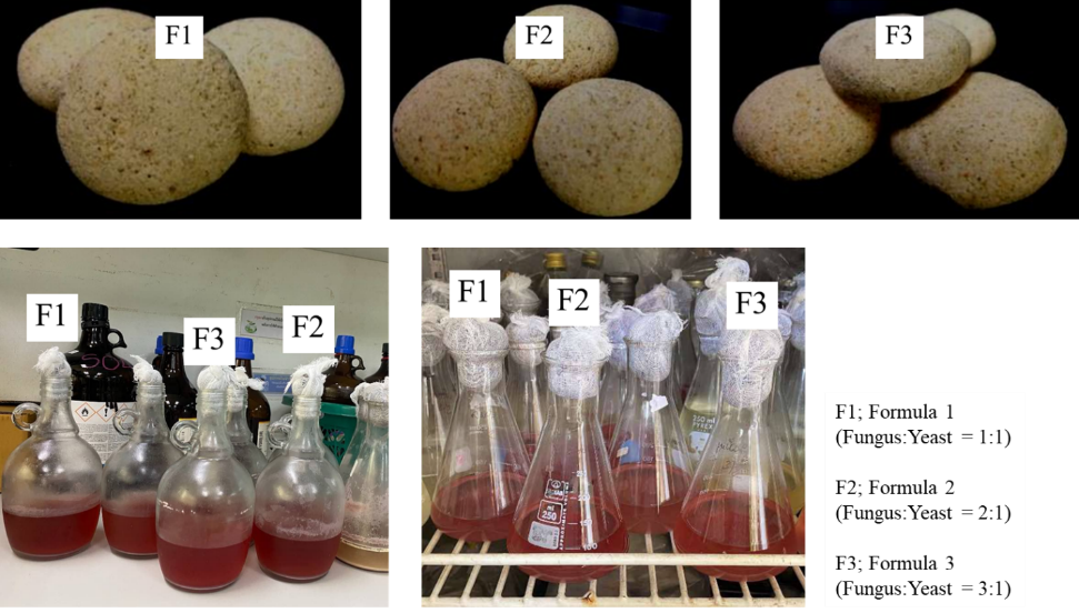 We found that the alcohol content of all 3 formulas is approximately 4.2%, which exceeds the standard limitation for ethanol content in an acetic acid product (less than 0.5%). Future work will focus on optimizing the fermentation conditions to control the use of ethanol by bacteria to produce more acetic acid. Moreover, we then further elucidating the impact on bioactive compound biosynthesis for industrial-scale applications.
