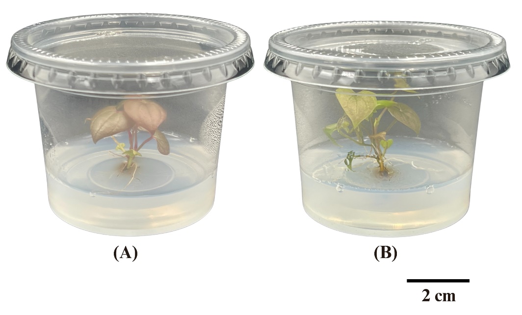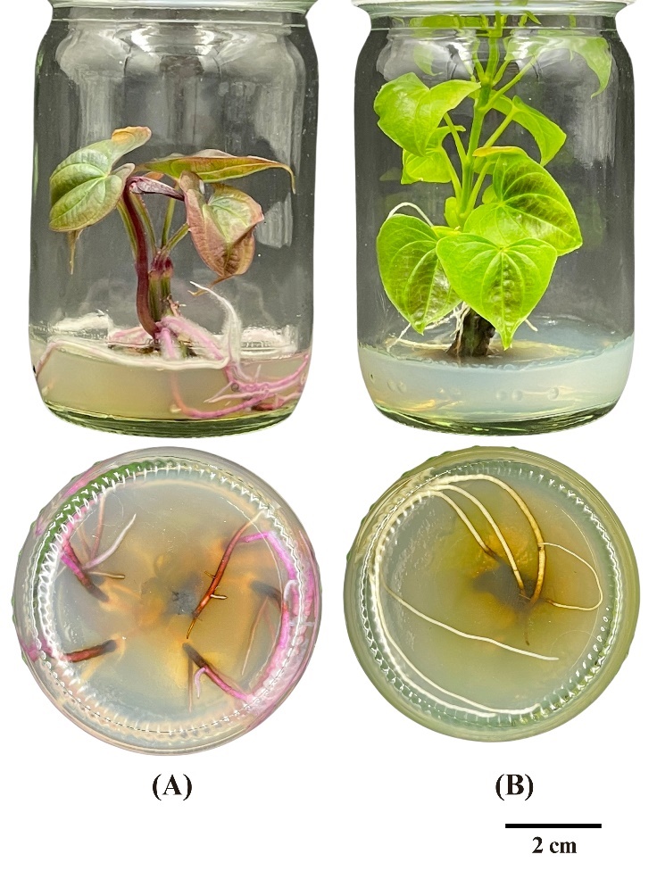 Figure 5 Morphological response of Dioscorea spp. explants cultured in MS medium disinfected with low-cost bleach treatment. (A) Purple-fleshed variety grown in 1 mL/L bleach showing enhanced shoot proliferation. (B) White-fleshed variety grown in 2 mL/L bleach displaying vigorous shoot and root development. Scale bar = 2 cm.