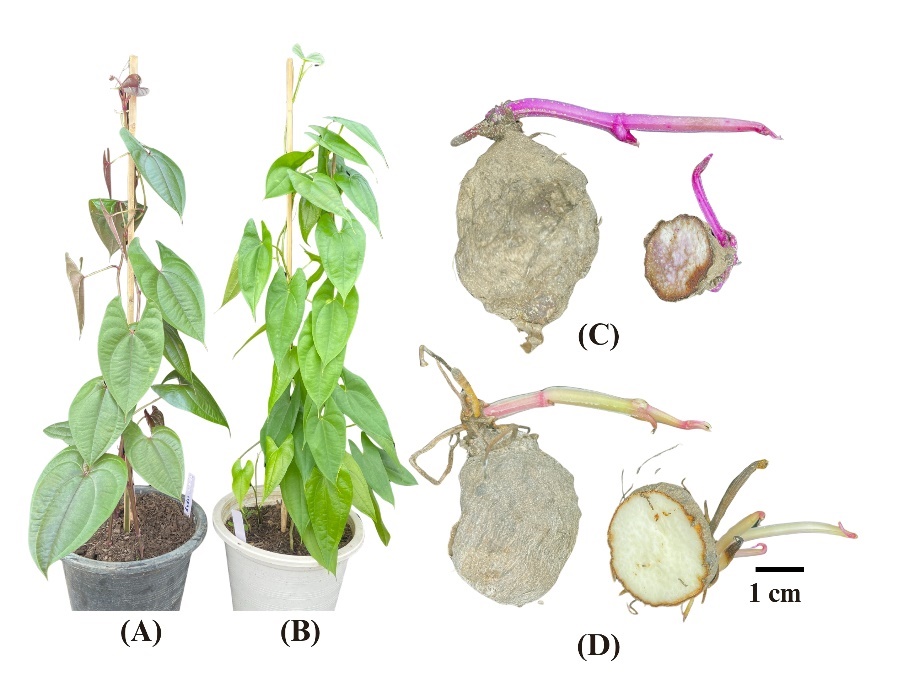 Figure 1 Morphological characteristics of indigenous Dioscorea spp. (A) Purple-fleshed and (B) white-fleshed varieties after 45 days of cultivation. (C) Purple-fleshed tubers with rough skin, violet flesh, and purple sprouts. (D) White-fleshed tubers with smoother skin, white flesh, and pale sprouts. Scale bar = 1 cm (C-D).