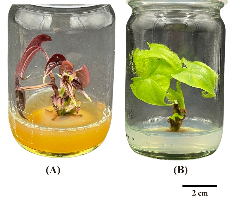 Figure 3 Morphological response of Dioscorea spp. explants cultured in MS medium supplemented with 1,000 mg/L PVP. (A) Purple-fleshed variety with visible browning and limited shoot development. (B) White-fleshed variety with minimal browning and vigorous shoot growth. Scale bar = 2 cm.