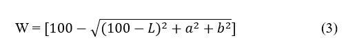The color of the analogue rice sample was determined based on the procedure described by Nielsen [15] using a colorimeter (Color Quest XE, Hunter Lab, Inc., USA). The results of the whiteness analysis are shown in the form of L, a, and b values. The total degree of color was measured using a white base. Therefore, whiteness can be calculated using Eq. (3).