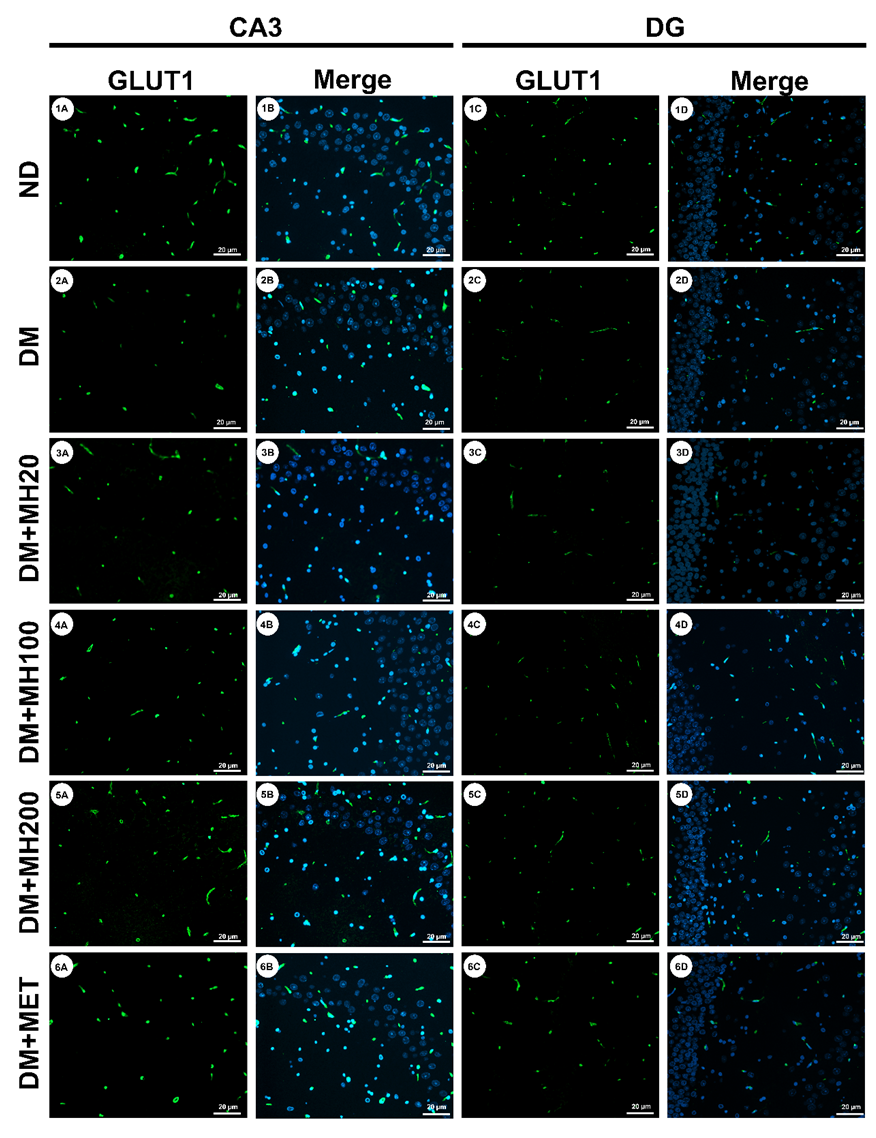 Figure 5 Effects Mathurameha on immunofluorescence staining of GLUT1 in the hippocampus of diabetic rat. Representative immunofluorescence images illustrate the expression of GLUT1 in hippocampal subregions, including the cornu ammonis area CA1 and the dentate gyrus (DG). GLUT1 immunoreactivity, shown in green, was predominantly localized to the endothelial cells of blood vessels and astrocytes. Nuclei were counterstained with Hoechst dye and appear in blue. Scale bars represent 20 μm. The experimental groups are as follows: ND = normal diet control rats; DM = diabetic rats; DM + MH20 = diabetic rats treated with Mathurameha at 20 mg/kg; DM + MH100 = diabetic rats treated with Mathurameha at 100 mg/kg; DM + MH200 = diabetic rats treated with Mathurameha at 200 mg/kg; DM + MET = diabetic rats treated with metformin.