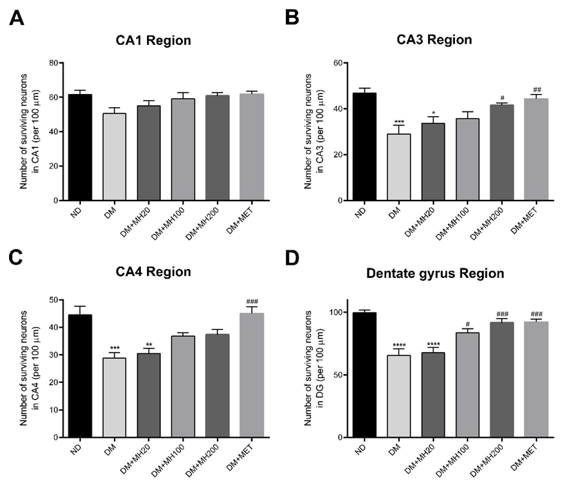 Figure 3 Quantification of surviving neurons in the hippocampal subregions is presented as mean ± SEM. Bar graphs (A-D) illustrate the number of surviving neurons in the CA1, CA3, CA4, and dentate gyrus (DG) regions across the experimental groups. Statistical analysis was performed using one-way ANOVA followed by Bonferroni post hoc tests. *** and **** indicate statistically significant differences at p < 0.001 and p < 0.0001, respectively, compared with the ND group. #, ## and ### indicate statistically significant differences compared to the DM group at p < 0.05, p < 0.01, and p < 0.001, respectively. ND = normal diet control rats, DM = diabetic rats, DM + MH20 = diabetic rats treated with Mathurameha at 20 mg/kg, DM + MH100 = diabetic rats treated with Mathurameha at 100 mg/kg, DM + MH200 = diabetic rats treated with Mathurameha at 200 mg/kg, DM + MET = diabetic rats treated with metformin