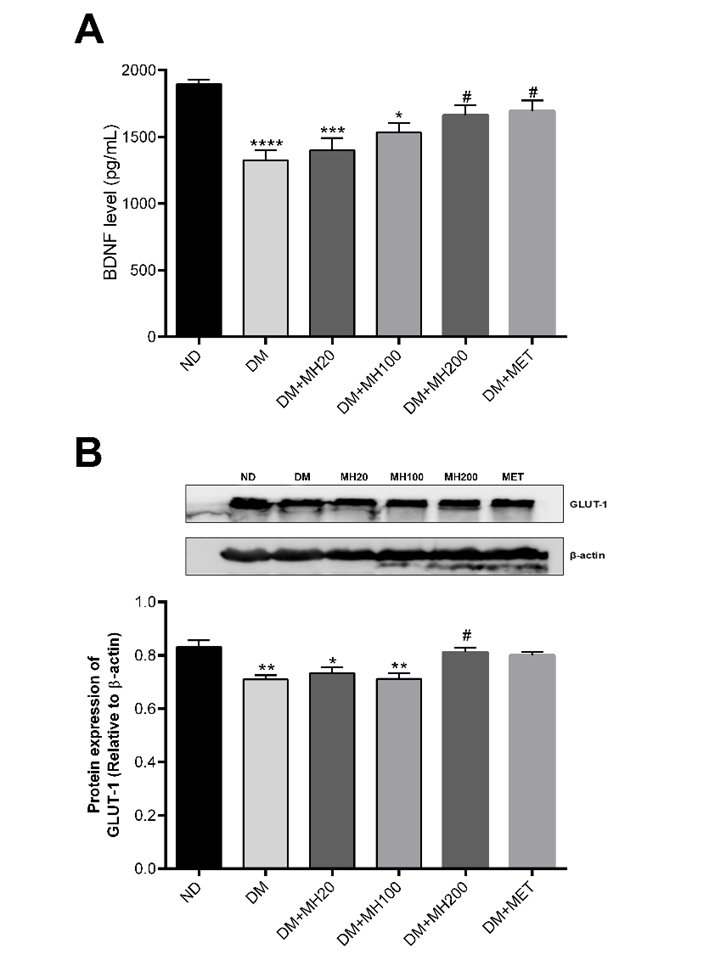 Figure 4 Effects Mathurameha on hippocampal BDNF and GLUT1 protein levels in a diabetic rat. (A) The level of BDNF in the hippocampus using ELISA technique B. Representative western blot images and histogram showing the quantification of GLUT1 intensity normalized to β-actin. Statistical analysis was performed using one-way ANOVA followed by Bonferroni post hoc tests. *, **, *** and **** indicate statistically significant differences at p < 0.05, p < 0.01, p < 0.001 and p < 0.0001, respectively, compared with the ND group. # indicates statistically significant differences compared to the DM group at p < 0.05.