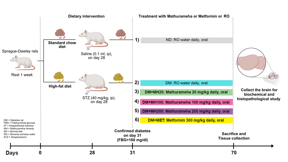 After a one-week adaptation period, rats were randomly assigned to 2 dietary groups: A normal diet group (ND; Group 1) and a type 2 diabetes mellitus group (DM; Groups 2 - 6). Rats in the ND group received a standard chow diet, while those in the DM group were fed a high-fat diet (HFD) for 3 weeks. The standard chow diet (10 kcal% fat; product no. D12450J) and the high-fat diet (60 kcal% fat; product no. D12492) were sourced from Research Diets, Inc. (USA). On day 28 of the experiment, rats in the HFD group received a single intraperitoneal (i.p.) injection of streptozotocin (STZ; Sigma-Aldrich, St. Louis, MO), dissolved in 50 mM citrate buffer (pH 4.5), at a dose of 40 mg/kg body weight, according to a modified protocol described by Srinivasan et al. [23]. Meanwhile, control rats were administered an i.p. injection of an equivalent volume of citrate buffer. Three days after the STZ injection, fasting blood glucose (FBG) levels were measured from the lateral tail vein using an Accu-Chek Performa glucometer (Roche Diagnostics Inc., Indianapolis, IN). Rats that exhibited classical diabetic symptoms of polydipsia and polyuria, along with FBG levels equal to or exceeding 160 mg/dL, were classified as diabetic in accordance with models aiming to mimic mild to moderate hyperglycemia or early-stage type 2 diabetes [24,25]. These rats were then subdivided into 5 treatment groups (groups 2 - 6, N = 6) for further study. Beginning on day 35, rats in both ND and DM groups were treated daily by oral gavage with either 1 mL saline (ND), Mathurameha remedy, or metformin until the end of the experimental period, as illustrated in Figure 1. The group allocations are as follows: