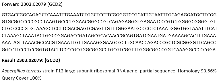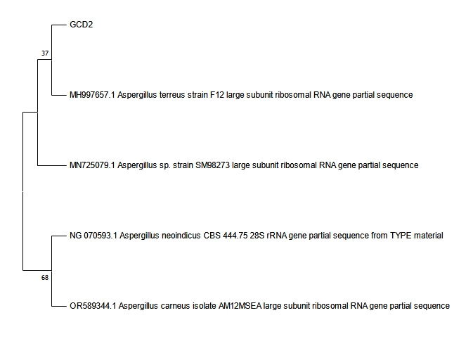 PCR products were sequenced by First BASE Laboratories (Malaysia), using high-throughput sequencing technology to ensure data quality and reliability. The resulting sequences were analyzed using the BLAST tool (https://blast.ncbi.nlm.nih.gov/Blast.cgi) to compare with sequences in the NCBI GenBank database. Species identification was performed based on the closest sequence similarity, following the approach described by Tallei and Kolondam. [21]. A phylogenetic tree was constructed using the neighbor-joining method with 1,000 bootstrap replications to confirm taxonomic placement. MEGA software (https://www.megasoftware.net/dload_win_beta) [22] was used to generate the tree and evaluate genetic relationships among related fungal species. The fungal isolate GCD2 was identified as Aspergillus terreus based on morphological features and ITS sequence homology.