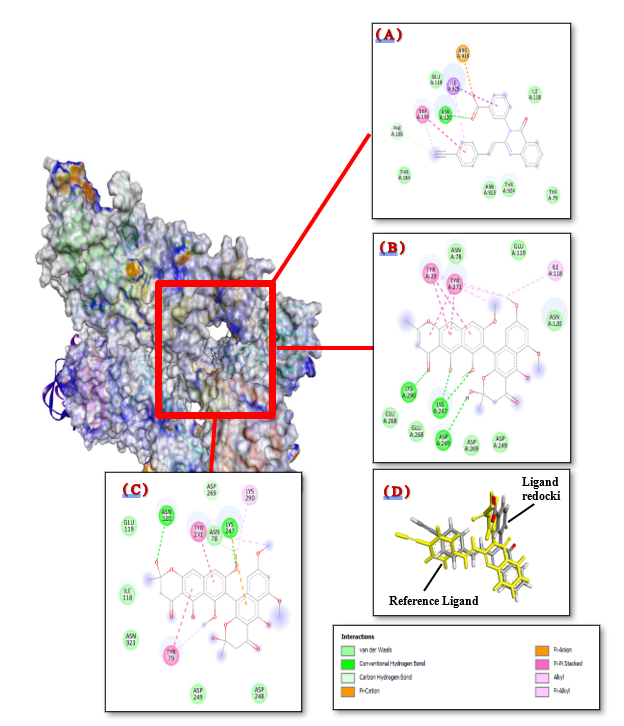 Molecular docking simulation begins with preparing the target protein, followed by preparing test ligands and native ligands. The docking process involves the interaction of test ligands and native ligands with the receptor's active site. The final stage consists of validating the molecular docking process and interpreting the results [27]. The target receptor was prepared in MOE using a quick preparation method, which aims to optimise the receptor structure by correcting the protonation and optimising the receptor's charge. Ligand testing in the preparation seeks to optimise the ligand energy with the MMFF94X force field, correcting the ligand charge and ligand structure to obtain an optimal ligand structure ready for molecular docking simulations. In the docking procedure, a range of binding modes was generated, and the one with the least binding energy, emphasising kcal/mol, was chosen as the most optimal [28]. Visualisation of ligand binding with receptors in 2D and 3D molecular docking results using BIOVIA Discovery Studio Visualizer software (https://discover.3ds.com/discovery-studio-visualizer-download) [29].
