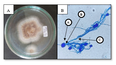 The morphological identification of the purified endophytic fungal isolate was initially conducted based on macroscopic and microscopic characteristics. Macroscopic features such as colony color, texture, margin, and growth rate were observed on Sabouraud Dextrose Agar (SDA) after incubation at room temperature (25 C) for 5 - 7 days. Microscopic examination was performed by preparing slide cultures stained with lactophenol cotton blue and observing the hyphal structure, conidiophores, vesicles, and spore morphology under a light microscope. Genomic DNA was extracted for molecular identification, and the internal transcribed spacer (ITS) region of ribosomal RNA was amplified using universal fungal primers. The ITS region comprises 4 parts: The large subunit rRNA, ITS1, 5.8S rRNA, and ITS2. The amplification and sequencing procedures followed the methodology described by Sandrawati et al. [11]. This work was conducted collaboratively between Genetica Science Indonesia (Tangerang, Banten) and the Environmental Biotechnology Laboratory (EBL) of the Indonesian Center for Biodiversity and Biotechnology (ICBB), Bogor, West Java, reflecting a joint commitment to robust and accurate species identification.