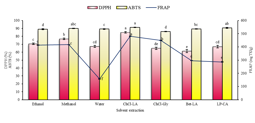 Figure 3 DPPH (bars), ABTS (bars), and FRAP (line) of GGLE extracted using different types of solvents. Data are presented as mean ± SD (n = 3). Different letters within the bars and line indicate significant differences (p < 0.05).