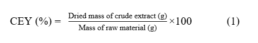 The prepared DESs and conventional solvents, namely ethanol, methanol, and water, were used for the extraction process. The protocol described by Zulkifli et al. [20] was followed with minor modifications to obtain the CEY from GGLE. A sample-to-liquid ratio of 1:30 g/mL was used, consisting of 5 g of DGGL and 150 mL of solvent. The mixture underwent UAE using a sonicator (QSonica, Newtown, CT, USA) operating at 60% amplitude for 10 min. After extraction, the mixture was filtered through filter paper to remove solid residues. Excess solvent was evaporated using a rotary evaporator (Heidolph, Schwabach, Germany) at 50 °C to concentrate the extract, followed by drying in a convection oven (Binder, Neckarsulm, Germany) for 24 h at 50 °C. The CEY was calculated using Eq. (1).