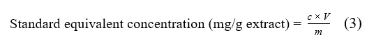 where c is the concentration of crude extract (mg/mL) obtained from the standard curve, m is the mass of sample (mg), and V is the volume of sample (mL).