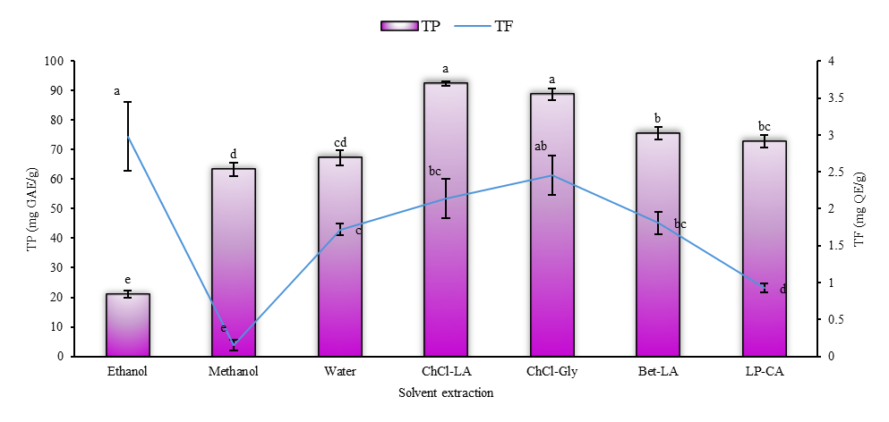 Figure 2 TP (bar) and TF (line) of GGLE extracted using different types of solvents. Data are presented as mean ± SD (n = 3). Different letters within the bar and line indicate significant differences (p < 0.05).
