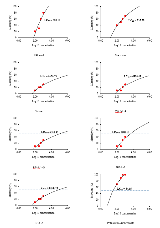 BSLA is a widely used method for the preliminary evaluation of cytotoxicity in natural products and plant-based extracts [27]. The non-toxic nature of DESs has been supported by previous studies. For instance, Saini et al. [28] reported that the DES composed of ChCl-LA produced an LC₅₀ value of 1,597.62 µg/mL when used to extract Peperomia pellucida leaves, indicating no observable toxicity. In contrast, methanol-extracted samples have consistently shown higher toxicity, as observed in studies involving Sargassum polycystum and Murraya exotica leaves [45,46]. Overall, these results reinforce the potential of DESs as safer and non-toxic alternatives to conventional organic solvents in natural product extraction. Further studies are recommended to evaluate in vivo efficacy using appropriate animal models. Such investigations would provide a more comprehensive understanding of the bioavailability, metabolism, and physiological effects of the extracts, as well as their safety profile under biological conditions. These studies would also help bridge the gap between in vitro findings and potential applications in human health.