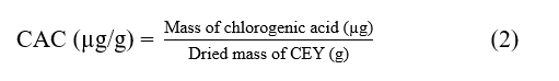 Using high-performance liquid chromatography (HPLC), the quantification of CAC was performed based on the method described by Saini et al. [21] with slight modifications. A chlorogenic acid standard (1 mg/mL) diluted in methanol was used as the standard reference. The analysis was conducted using an Agilent 1100 system (Agilent Technologies, Santa Clara, CA, USA) equipped with an InertSustain C18 column (5 µm, 150 × 4.6 mm2) and an ultraviolet-visible (UV-Vis) detector. The mobile phases consisted of (A) 0.1% acetic acid in ultrapure water and (B) acetonitrile, operated under isocratic elution. The total run time was 20 min, with the column temperature set at 30 °C and the flow rate maintained at 0.8 mL/min. A 20 µL sample was injected into the system, and detection was carried out at a wavelength of 325 nm. Before injection, each sample was filtered through a 0.22 µm syringe filter. The CAC of GGLE was determined using Eq. (2).
