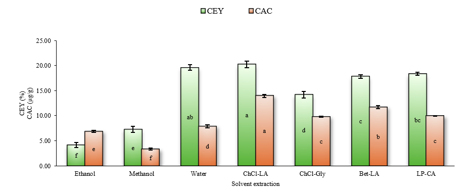 Figure 1 CEY and CAC of GGLE extracted using different types of solvents. Data are presented as mean ± SD (n = 3). Different letters within the bars indicate significant differences (p < 0.05).
