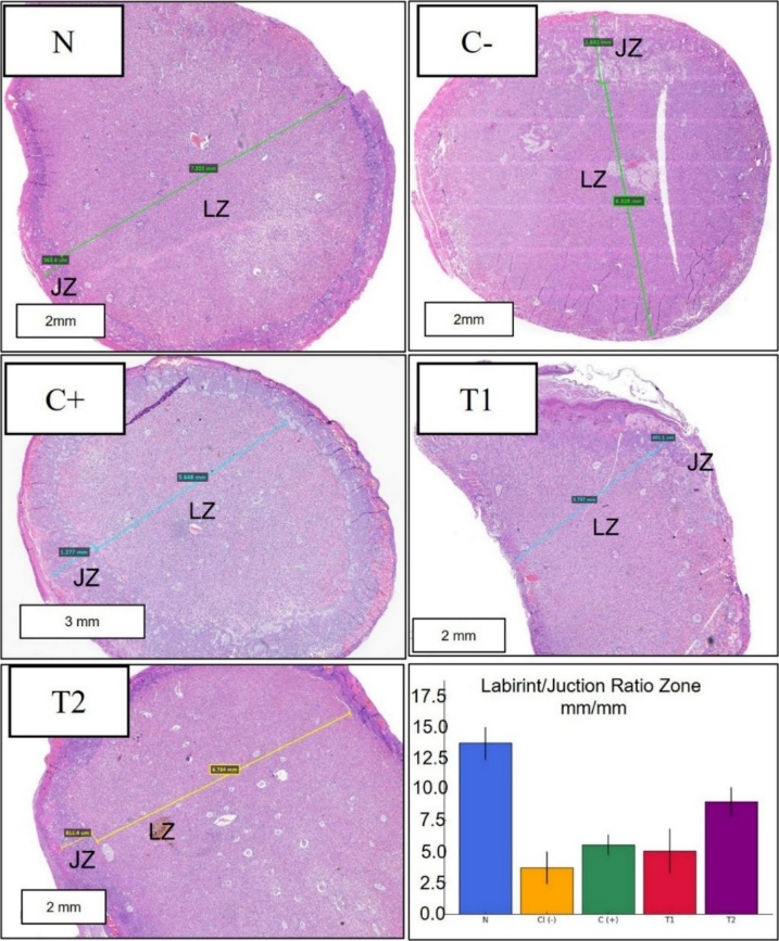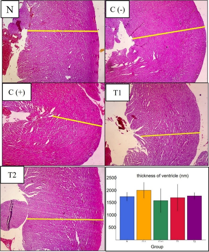 Histopathological measurements on the heart and placenta organs using the HE staining method. Cardiac ventricular thickness indicates cardiovascular disorders. The ratio zone labyrinthine/junction shows the balance between the exchange of substances and hormonal structures in the placenta and the preeclampsia model. The heart and placental tissues were cut and then fixed in 10% formalin solution, and dehydration was continued with 70% ethanol until absolute ethanol. Oxylene was used for clearing, infiltration, and embedding in paraffin. The tissue was cut with a 3 - 5 µm thickness using a microtome, then attached to a glass slide. The samples were dried, deparaffinized, dehydrated, and stained with H&E using the protocol from Histoline [26]. Analysis using a light microscope (Leica, Germany). Measurement of ventricular thickness using the transverse zone from the endocardium to the epicardium [27]. In the labyrinthine zone and junction zone, use the central cut and then count the ratio from the long labyrinthine to the junction [23].