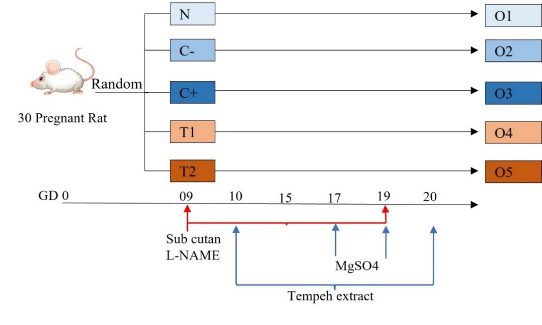 Rats acclimatized for seven days are then mated when they reach the estrus cycle with a male rat by monomating. The diagnosis of pregnancy is obtained approximately 17 h after mating, by checking for the presence of a copulatory plug that closes the vagina to the cervix, as well as the presence of sperm in the vaginal smear. If proven pregnant, the female rat will be declared on day 0 Gestational Day (GD) 0. The mice were then randomly divided into 5 groups. These groups were divided into: Normal (N) with No Treatment, Negative Control (C‒) induction with L-NAME group only, Positive control (C+) treatment with L-NAME + MgSO4, Treatment 1 (T1) treatment with STE, Treatment 2 (T2) L-NAME + MgSO4 + STE. The dose of L-NAME was given at 75 mg/ kgBW /day subcutaneously. On 9-19 GD [23]. Administration of MgSO4 270 mg/KgBW/day on 17 and 19 GD [5]. The optimum dose of STE, based on preliminary studies of 100, 200 and 400 mg/kgBW/day, and the optimum dose of 400 mg/kg/BW was found to be the best at lowering blood pressure in the preeclampsia rat model (Figure 1).