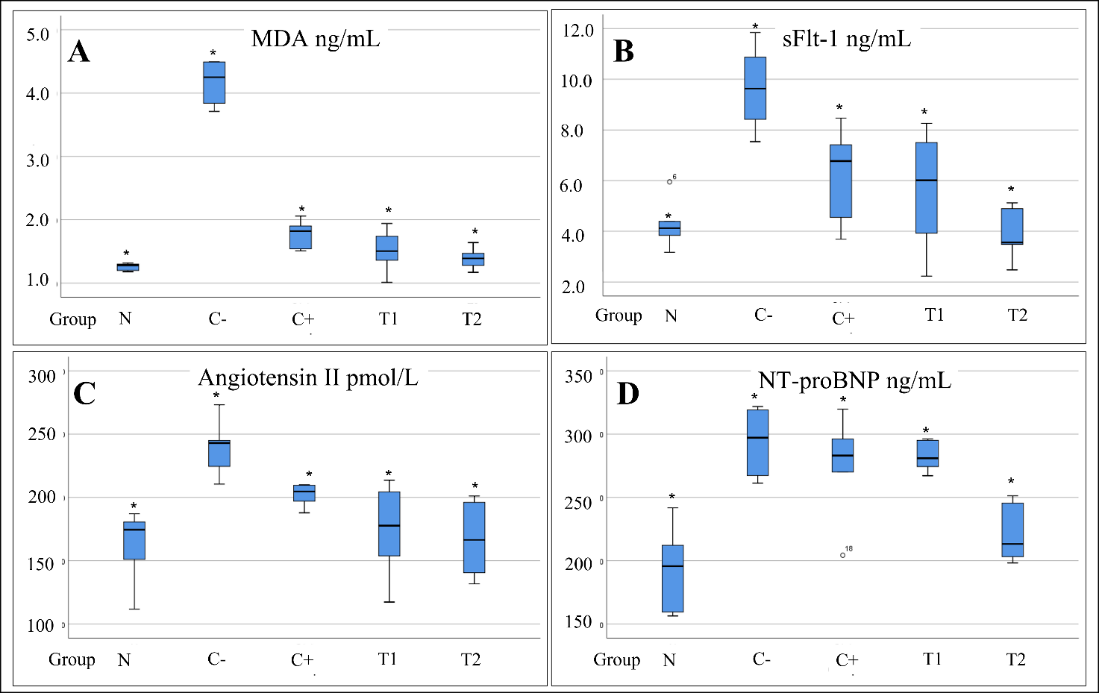 MDA marker analysis of oxidative stress, NT-ProBNP cardiac marker, sFlt-1 marker angiogenic, and Angiotensin blood pressure marker using blood serum and ELISA testing. The ELISA procedure uses the sandwich method. The procedure begins with adding 50 μl of standard into the well. 40 μl of sample was added to the well, then 10 μl of biotinylated antibody was added. Into the sample well, 50 μl Streptavidin-HRP was added to the wells (except blank control), mixed, covered the plate with sealer, and incubated for 60 min at 37 °C. Remove the sealer. Then wash the plate 5 times with wash buffer (300 μl per wheel), then let stand for 30 - 60 s. Dry the plate on absorbent paper. Add 50 μl of substrate per well and incubate for 10 min at 37 °C in the dark, then add 50 μl of stop solution until the well turns from blue to yellow (10 min). Measurement of absorbance values at a Wavelength of 450 nm using a microplate reader [25].