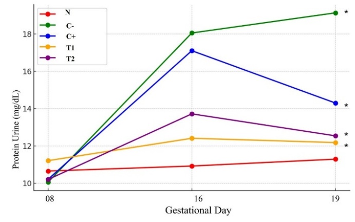 The effect of STE on protein repair can be seen from Group N having stable urine protein levels from GD-8 to GD-19 (p value > 0.05). In contrast, the negative C‒ experienced a significant increase in urine protein from GD-8 to GD-16 (p value < 0.001). The C+ also showed a similar increase pattern, but not as high as C‒ (<0.001). Groups T1 and T2 showed lower urine protein levels but still had a significant increase (p value < 0.05). The inter-group test showed no significant difference in GD-8 (p value 0.148), but there was a significant difference in GD-16 and GD 19 (p value < 0.001). This confirms that STE effectively reduces or prevents increased proteinuria in the preeclampsia rat model (Table 4).