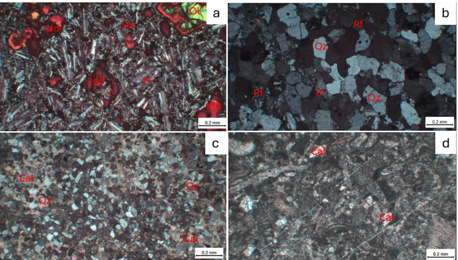 Figure 4 Photomicrographs under cross-polarized light: (a) Olivine basalt (BSG-1) with olivine phenocrysts altered to iddingsite (Idd) in a plagioclase-rich groundmass; (b) Quartz arenite (SSK-2) with quartz (Qz), plagioclase (Pl), biotite (Bt), and rock fragments (Rf); (c) Calcareous sandstone (SPW-2) dominated by quartz (Qz) and calcite (Cal); (d) Packed biomicrite (LSP-1) with micritic matrix and fossil fragments. Abbreviations: Pl - plagioclase, Ol - olivine, Idd - iddingsite, Ser - sericite, Qz - quartz, Bt - biotite, Rf - rock fragments, Cal - calcite.