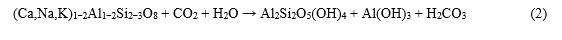 Sandstone produced a light brown suspension with thin white film precipitates, suggestive of kaolinite formation from plagioclase breakdown [20,21] in Eq. (2):
