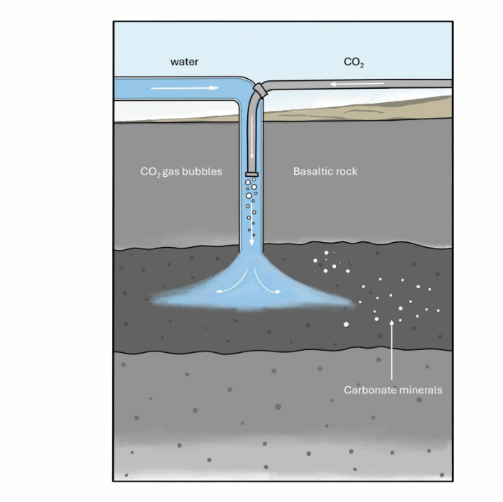 Figure 3 Carbon storage in basaltic rocks, CO 2 is first dissolved in water and then injected into porous basaltic formations. Because the CO 2 is in dissolved form, it is non-buoyant and does not require a cap rock to prevent migration. Solubility trapping occurs immediately upon injection, and within approximately 1 year [8], most of the injected carbon is permanently sequestered through mineralization into stable carbonate minerals.