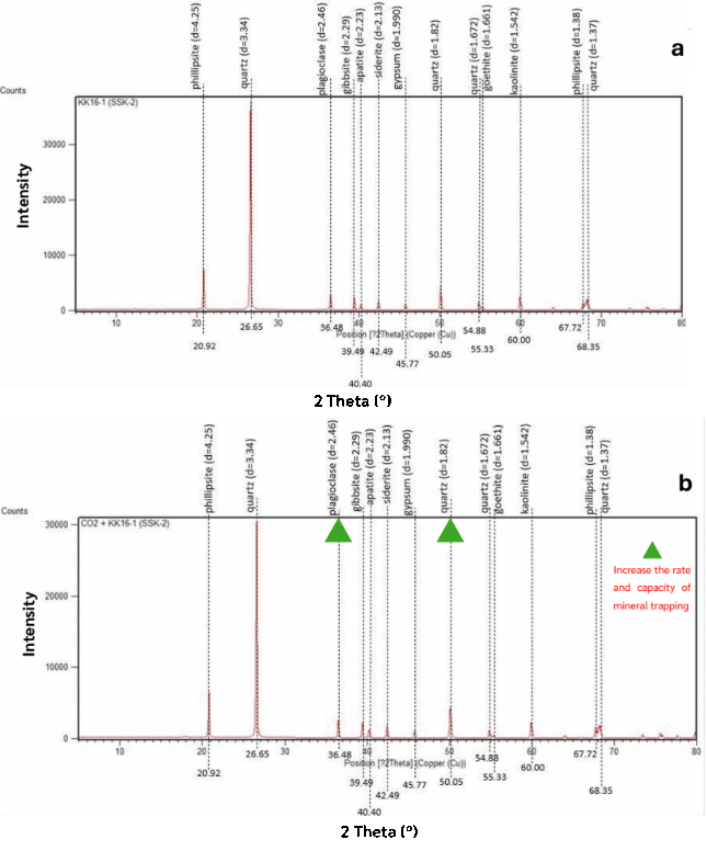 Figure 7 X-ray diffraction (XRD) patterns of quartz arenite sandstone sample SSK-2 before (a) and after (b) CO 2 -water interaction. (a) The untreated sandstone is dominated by quartz, with subordinate plagioclase, siderite, apatite, kaolinite, gypsum, and gibbsite. The high quartz peak intensities reflect a mechanically robust but chemically less reactive framework. (b) After reaction, the mineralogy remains largely unchanged, but gibbsite, quartz, and kaolinite peaks increase in intensity (green triangles), and goethite appears. These changes suggest limited silicate dissolution with secondary hydroxide and oxide precipitation, contributing modestly to mineral CO 2 trapping capacity.