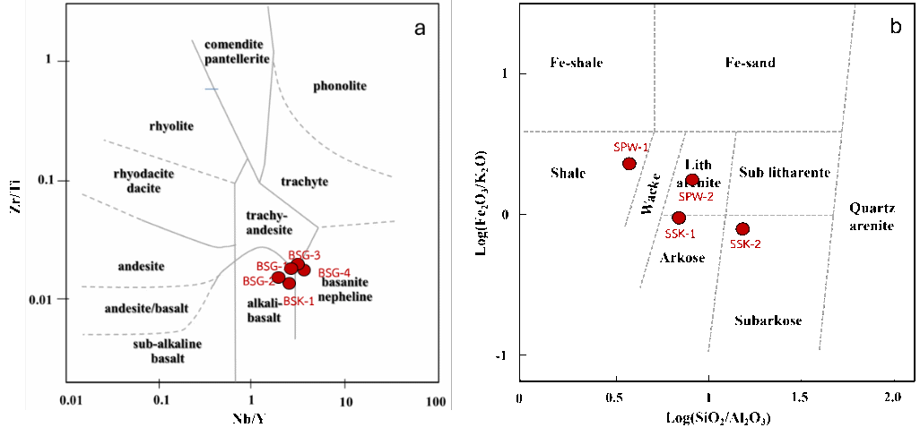 Figure 5 Rock classification based on geochemical characteristics: (a) Classification of volcanic rocks using Zr/Ti versus Nb/Y ratios, modified from Winchester and Floyd [17], showing BSG-1, BSG-2, and BSK-1 in the Alkali basalt field, BSG-3 in the Trachyte andesite field, and BSG-4 in the Basanite nepheline field; (b) Classification of clastic sedimentary rocks using log(Fe 2 O 3 /K 2 O) versus log(SiO 2 /Al 2 O 3 ) ratios, modified from Herron [18], with SPW-1 plotting in the Fe-shale field, SPW-2 in the Wacke field, and SSK-1 and SSK-2 in the Subarkose and Arkose fields.