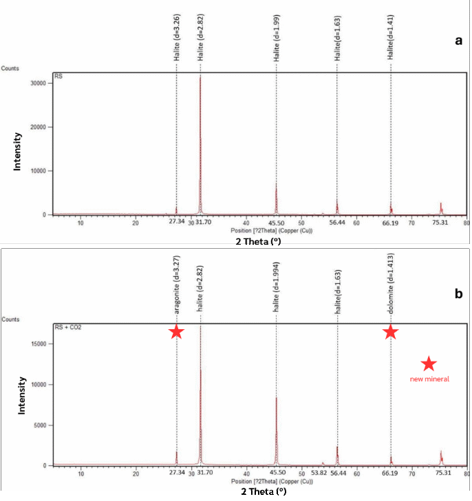 Figure 10 X-ray diffraction (XRD) patterns of rock salt sample RS before (a) and after (b) CO 2 -water interaction. (a) The untreated rock salt consists almost entirely of halite (NaCl), with sharp, high-intensity peaks reflecting its purity and crystallinity. (b) After reaction, halite peaks decrease in intensity, and new carbonate phases - aragonite and dolomite - appear, suggesting reaction between CO 2 -saturated solution and trace Ca 2+ /Mg 2+ impurities in the halite. This demonstrates that even chemically simple evaporites can host localized carbonate precipitation under CO 2 storage conditions.