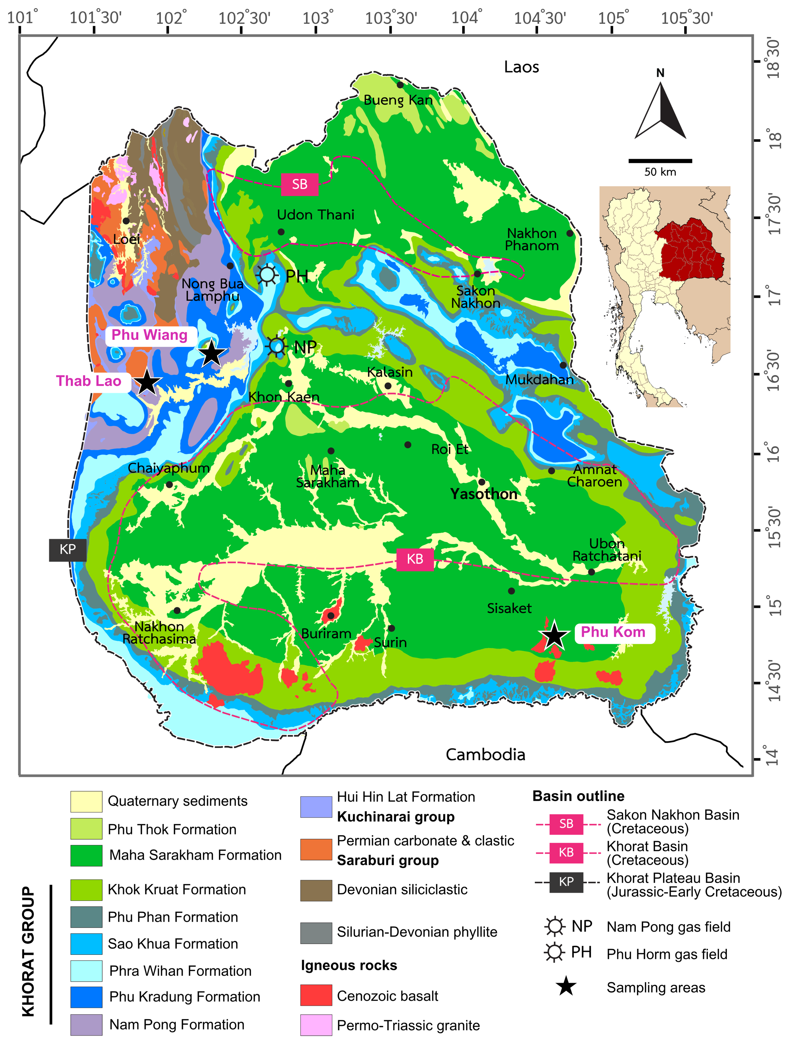 Figure 2 Simplified geological map of the Khorat Plateau showing the main producing gas fields and sampling locations (black stars). Geological data adapted from Geological Survey Division [11].
