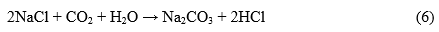 Halite exhibits minimal reactivity with CO 2 under ambient pressure and temperature. Experimental observations revealed a rapid initial temperature increase to 77 °C, resulting from halite dissolution and rapid ion exchange in the electrolyte-rich brine, followed by stabilization at the set point of 60 °C. Post-reaction, white condensates on the aluminum foil indicated halite sublimation and subsequent re-precipitation. No significant new mineral phases formed under the applied conditions (1 atm, 60 C, 24 h). Nevertheless, theoretical reaction pathways suggest that under elevated temperature and pressure, halite may react with CO 2 and water to produce sodium carbonate and hydrochloric acid [23] (Eq. (6)).