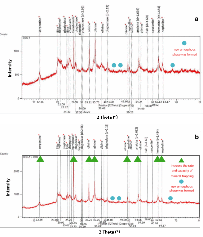 Figure 6 X-ray diffraction (XRD) patterns of basalt sample BSG-1 before (a) and after (b) CO 2 -water interaction. (a) The untreated basalt displays a diverse igneous assemblage, including olivine, plagioclase, pyroxene, hornblende, nepheline, serpentine, chlorite, talc, hematite, illite, chamosite, and analcite. The light blue circles highlight a broad, low-intensity region interpreted as an amorphous phase, likely alteration products or volcanic glass. (b) Post-reaction analysis shows increased intensities for several silicate and oxide phases (green triangles), indicating enhanced crystallinity or reprecipitation of secondary minerals. The persistence of the amorphous phase suggests incomplete crystallization, while the intensity changes point to dissolution–precipitation processes enhancing mineral trapping potential in basalt.