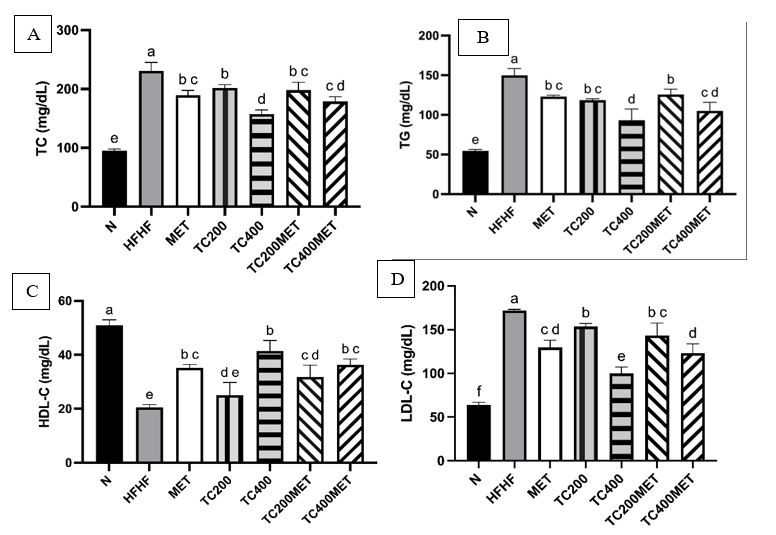 Figure 3 Graphs of lipid profile. Level of TC (A), TG (B), LDL-C (C) and HDL-C (D). Following treatment with T. crispa extract. Data are presented as mean ± SD. Data are presented as mean ± SD. Different legend letters (a, b, c, d) denote statistical among the groups (p-value ≤ 0.05). The presence of duplicate letters indicates no significant difference between those groups.