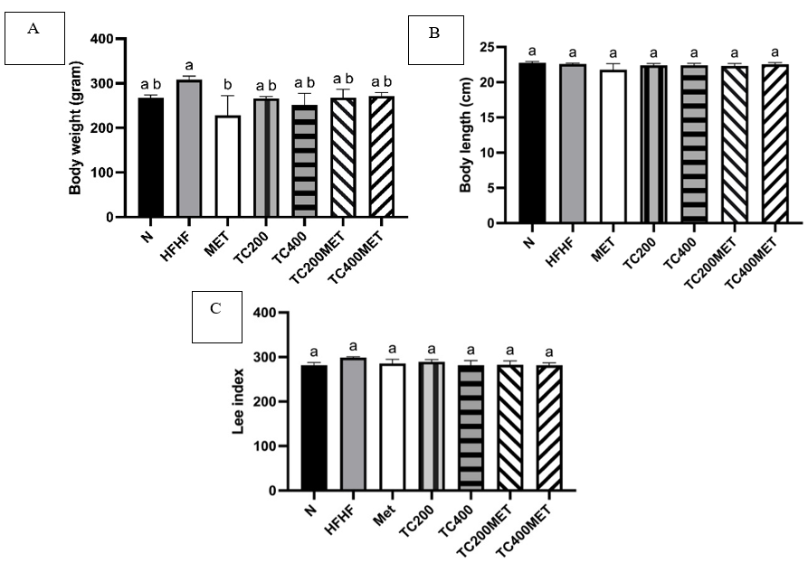 At the end of the study, the mean body weights (g) of the rats in groups N, HFHF, MET, TC200, TC400, TC200MET and TC400MET were 267 ± 6.63, 308 ± 8.00, 228 ± 44.78, 266.5 ± 3.78, 252 ± 25.03, 267.5 ± 18.43 and 271.5 ± 8.00, respectively. As shown in Figure 1(A), the HFHF group exhibited increased body weight following HFHF induction, although the increase was not statistically significant compared to the N group. Treatment with T. crispa extract (TC200, TC400, TC200MET, TC400MET) led to a reduction in body weight; however, the differences were not significant compared to the HFHF group. A significant decrease in body weight was observed only in the MET group. Body length did not differ significantly among groups, with mean values (cm) for the N, HFHF, MET, TC200, TC400, TC200MET, and TC400MET groups recorded as 22.75 ± 0.20, 22.60 ± 0.11, 21.78 ± 0.86, 22.40 ± 0.25, 22.40 ± 0.27, 22.33 ± 0.34, and 22.55 ± 0.24, respectively (Figure 1(B)). The Lee index values for the N, HFHF, MET, TC200, TC400, TC200MET, and TC400MET groups were 281.6 ± 6.43, 298.8 ± 2.13, 285.7 ± 9.59, 289.3 ± 4.76, 281.5 ± 10.67, 282.6 ± 8.98 and 281.6 ± 5.49, respectively. Statistical analysis indicated no significant differences in Lee index values among the groups (Figure 1(C)). These data indicate that all groups showed both body weight and length gain throughout the study period.