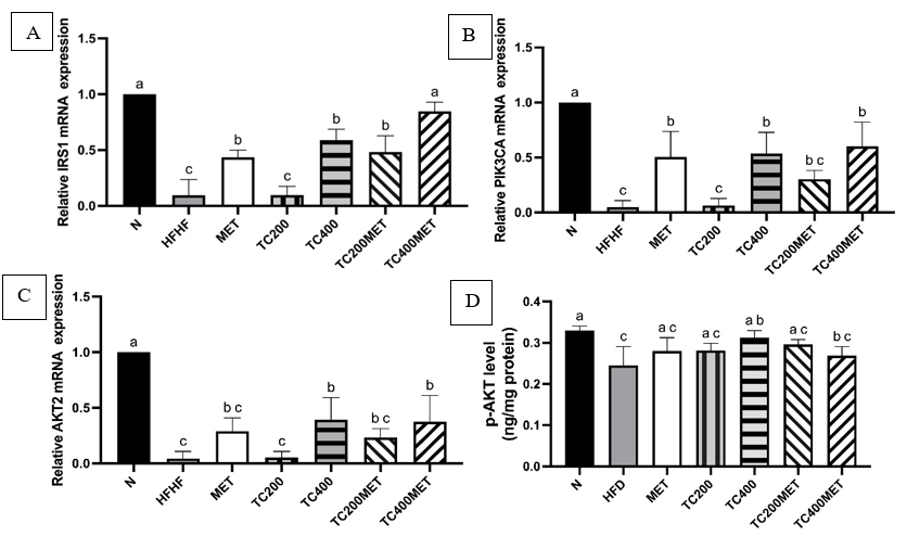 One of the key proteins that works as a mediator when insulin connects to its receptor on the cell’s surface is IRS1. Once insulin binds, it triggers the phosphorylation of IRS1, setting off a cascade of signals within the cell, including the PI3K/AKT pathway. This process plays a crucial role in regulating various cellular functions, including the regulation of glucose metabolism. The analysis of IRS1 gene expression revealed a significant decrease in IRS1 mRNA levels in the HFHF group compared to the N group. Following treatment, relative mRNA expression levels in the Met, TC400, TC200Met and TC400Met groups increased significantly compared to the HFHF group, as illustrated in Figure 4(A) The most substantial increase was observed in the TC400Met group, where the relative mRNA expression increased by 0.84-fold, approaching the expression level observed in the N group. The relative mRNA expression of PIK3CA, a crucial gene that codes for the catalytic subunit of PI3K, showed a significant reduction to 0.048-fold compared to the N group post-administration of HFHF induction (Figure 4(B)). After treatment, PIK3CA expression significantly increased in groups receiving metformin alone, T. crispa extract at a dose of 400 mg/kgBW, or its combination with metformin. A similar pattern was observed in the relative mRNA expression of the AKT2 gene (Figure 4(C)), with elevated expression in groups treated with metformin, T. crispa extract (400 mg/kgBW) and both combination therapy groups. However, only the TC400 and TC400MET groups demonstrated a statistically significant increase in AKT2 expression compared to the HFHF group. At the end of the study, the HFHF group showed a marked decrease in p-AKT concentration levels compared to the N group (Figure 4(D)), indicating impaired activation of the insulin signaling pathway. Notably, only the TC400 treatment group showed a significant increase in p-AKT levels relative to the HFHF group. These levels approached those observed in the N group, suggesting that T. crispa extract may enhance AKT phosphorylation and partially restore insulin.