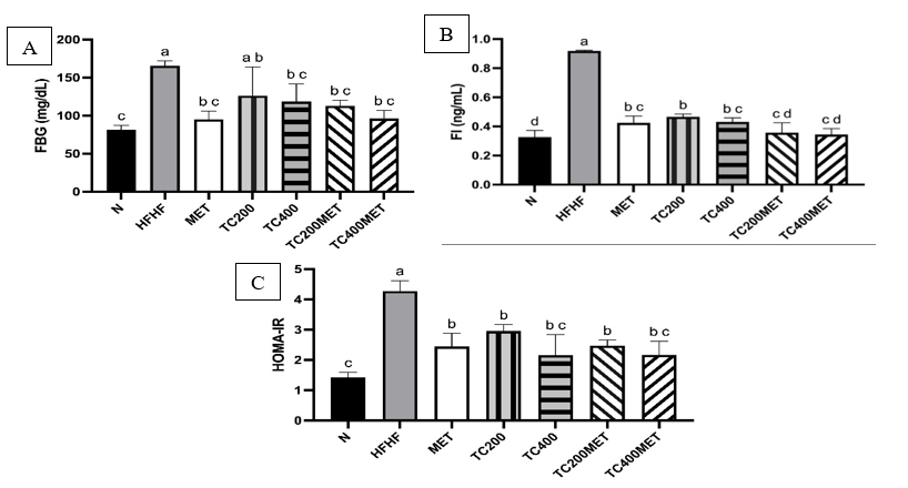 Consistent with the fasting blood glucose results, fasting insulin levels (Figure 2(B)) significantly decreased in all treatment groups compared to the HFHF group. The mean fasting insulin levels in the Met, TC200, TC400, TC200MET, and TC400MET groups were 0.42 ± 0.04, 0.46 ± 0.02, 0.35 ± 0.07 and 0.34 ± 0.04 ng/mL, respectively—values that were comparable to those of the N group (0.33 ± 0.04 ng/mL) and significantly lower than the HFHF group (0.92 ± 0.01 ng/mL). These findings indicate a significant increase in insulin levels following HFHF induction, which was attenuated by the subsequent treatments.