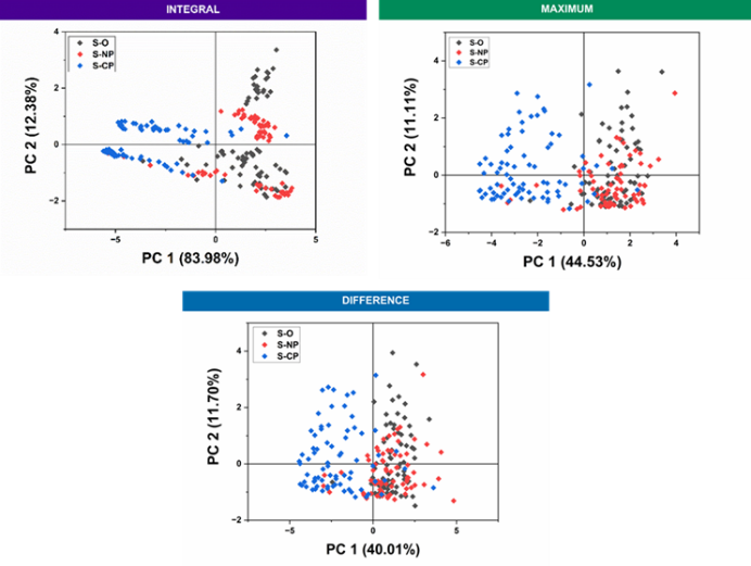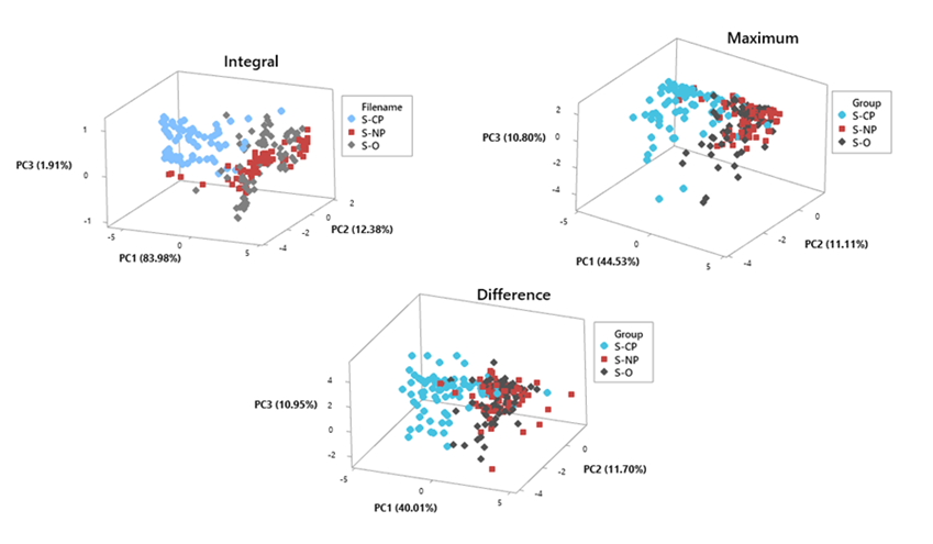 This study employed an e-nose system to evaluate the effectiveness of 3 feature extraction techniques—maximum, difference, and integral—in distinguishing preservative treatments in coconut sap. Among the tested approaches, the integral feature extraction method consistently outperformed maximum and difference methods, as demonstrated by clearer cluster separation in PCA visualizations and superior classification accuracy.